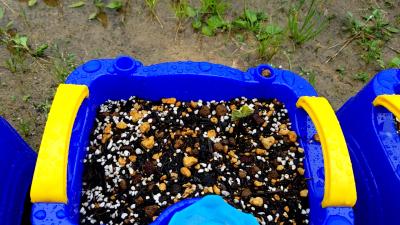 1年生が植えて、「早く芽が出てね」とお水をあげていたあさがおの芽が出始めました。