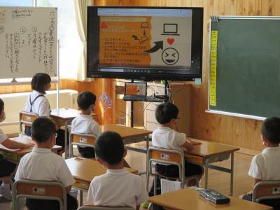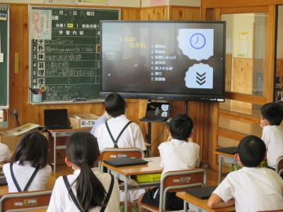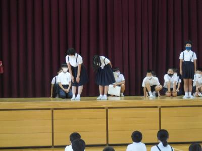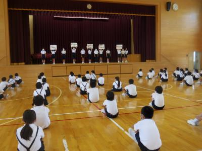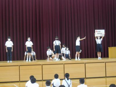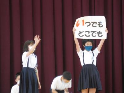 6月22日(火)の全校集会で児童会が全校児童に挨拶を呼びかけました。5・6年生は体育館で1~4年生は教室で集会に参加しました。