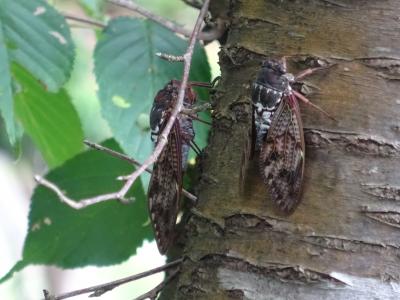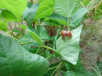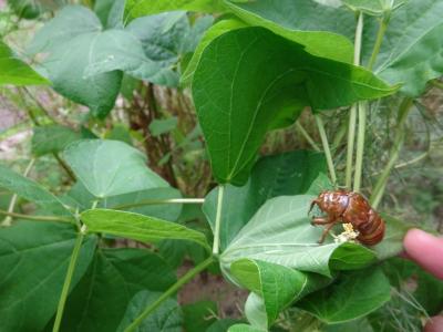 明日8月5日(木)全校登校日です。児童玄関前の植物にせみの抜け殻をいくつも発見しました。そして、せみも・・・。