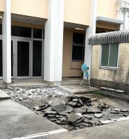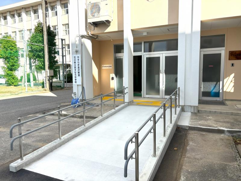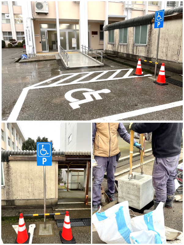 がっこうの げんかんまえには、くるまいすの かたが りようする ちゅうしゃ すぺーすを かくほして ありましたが、そのことを わかりやすく するために、けいじばんを せっちして いただきました。