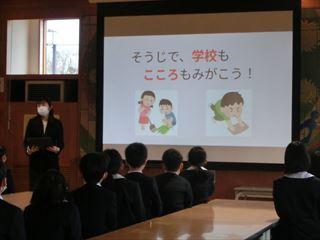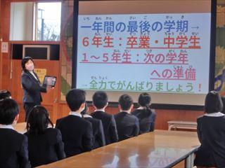いよいよ3学期がスタートしました。始業式では,校長先生から「1年間の最後の学期です。次の学年に向けて苦手を克服し,より良い自分を目指して全力で頑張りましょう」というお話がありました。その後,山本先生から「そうじで学校もこころもみがきましょう」というお話がありました。子どもたちは,新たな目標に向かって頑張ろうという気持ちになっていました。