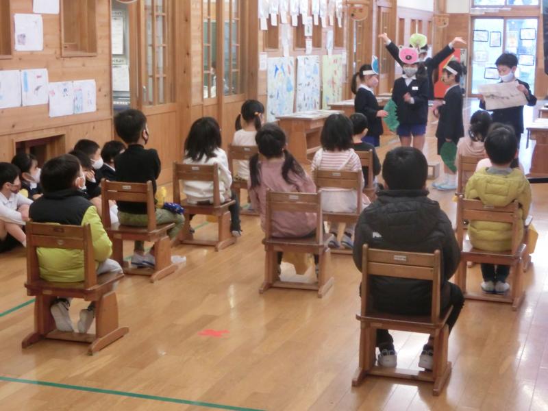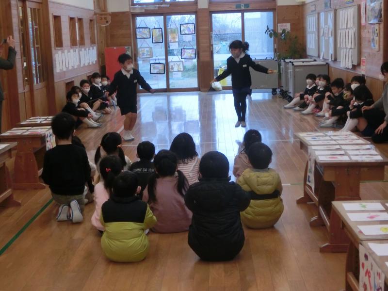 1年生17名が歌や縄跳びやお店屋さんなど,楽しい企画で年長さんをもてなしてくれました。