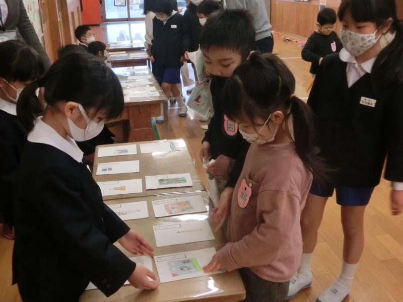 掲示を見ているところです。いいところはどこか聞いてみたところ,2人はとても上手に説明してくれました。