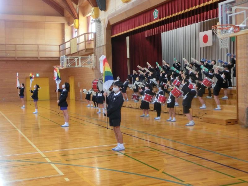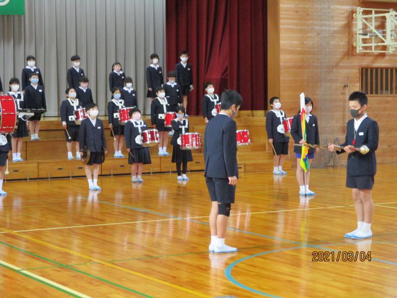鼓笛の引継式がありました。6年生の中山さんから5年生の酒井さんに指揮杖が渡された後、2年から5年で