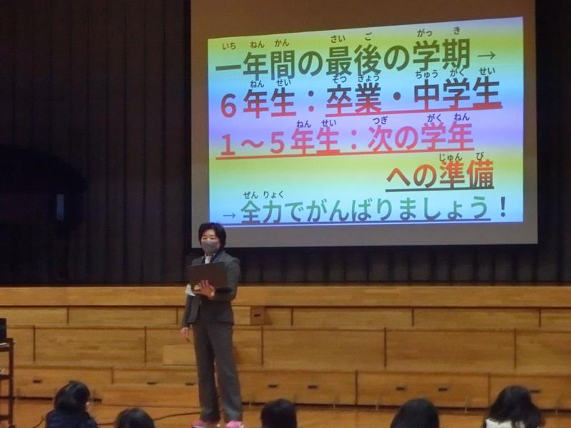 いよいよ3学期のスタートです。校長先生から,冬休みの振り返りをもとに次の学年へ進級するために