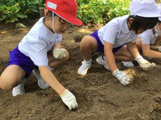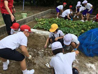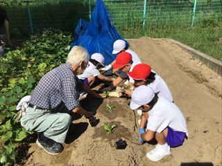 老人会の大橋さん,中村さん,川渕さんの指導のもと,4年生と6年生がサツマイモほりをしました。サツマイモを途中で折らないように丁寧に土をかきわけ,上手にサツマイモをほり出していました。夏場の暑い時期にも,しっかりと水やりのお世話をしたので,大きなサツマイモを収穫することができました。