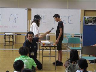 4色の縦割り班に分かれて英語のゼスチャーリレーを楽しみました。What do you want? I want ゼスチャーのやり取りを,全力のゼスチャーと全力の英語で答え,みんなで盛り上がりました。