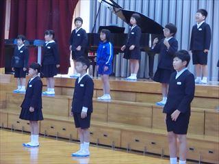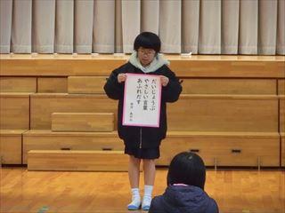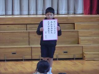 全校集会では,読書感想文コンクール,校内図画大会,マラソン大会の表彰を行いました。代表児童は大きな声で感想発表することができました。児童集会では,今月の英語歌(2・3年生担当)の発表,1~4年の英語の発表,5・6年の合唱が披露されました。