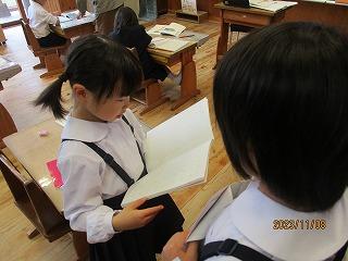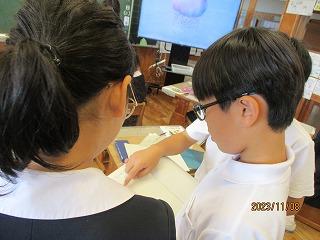 1年生は国語科の学習をしていました。読んだ物語の感想をペアで伝え合っていました。ペアをつくるときの「いっしょにやろう」の声掛けが素敵でした。