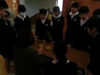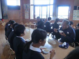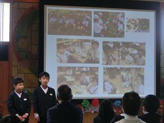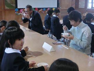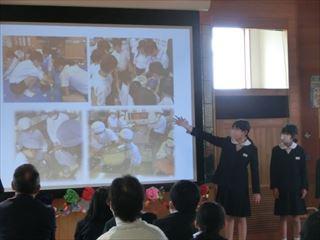 子どもたちが畑の先生と一緒に育てたサツマイモや白菜などを使ってめった汁を作りました。畑の先生をはじめ,一年間お世話になった見守り隊や図書ボランティアの方々もお呼びして一緒に食べました。また,「畑自慢」のプレゼン発表やプレゼント渡し,5・6年生による合唱なども行い,みんなで感謝の気持ちを伝えることができました。