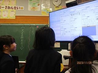 1年生が国語科で感じたことを伝え合う活動をしていました。ロイロノートの提出箱をみて,興味のある内容を書いている子を探し,フリートークをしています。