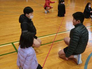 きずな集会では,まず各学年の代表が人権標語の発表をしました。次に,「スマイルアゲイン」の歌を6年生と一緒に手話を交えて歌いました。最後に,人数集めゲームをしてみんなで盛り上がりました。