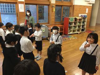 4月から入学する子ども達7名(こすもす保育園と白百合幼稚園の年長さん)を招いて1年生と交流しました。1年生は,くじらぐもの音読発表をしたり,大縄の8の字跳びを紹介したりしました。最後には,お店屋さんごっこをしてペットボトルゴマや紙飛行機などをプレゼントをしました。