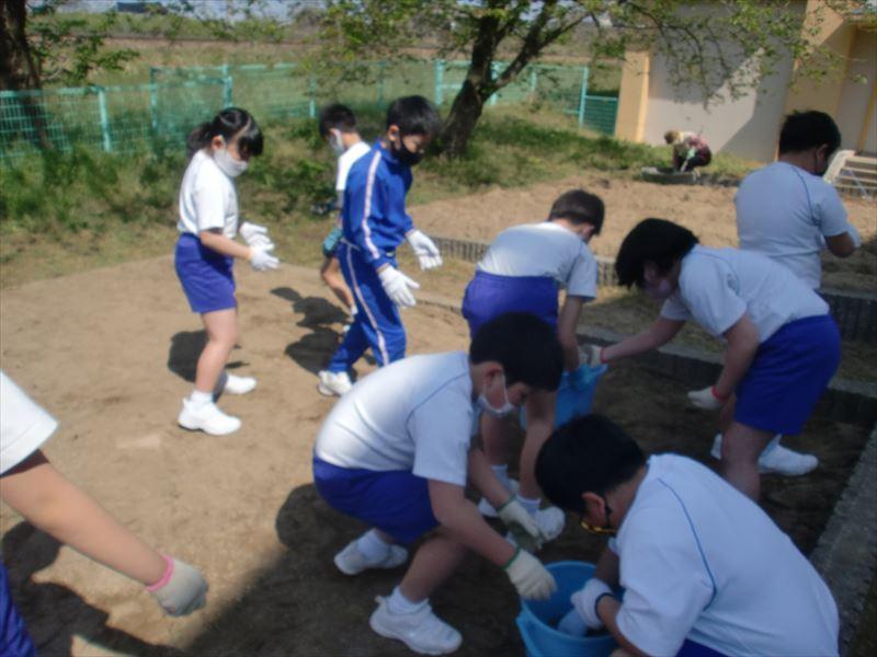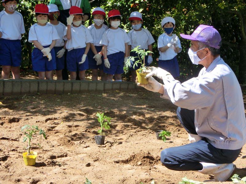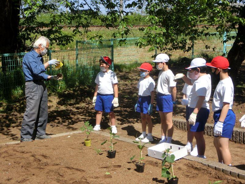 今年度は土づくり・苗植えともに、畑・米の先生のご指導で子どもたちの手で行うことができました。講師の