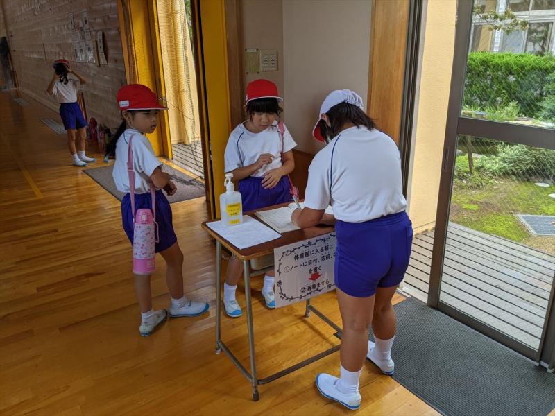 長休みや昼休みに体育館を利用する際、記名とアルコール消毒を行うことになりました。体育館の入り口