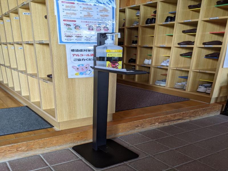※玄関に、新たに「足踏み噴射式」のアルコール消毒ポンプを設置しました。容器に触れずに、消毒液を