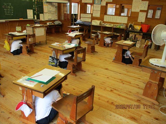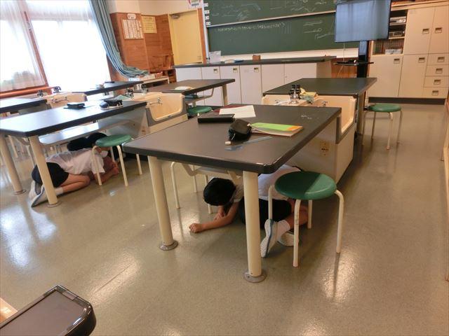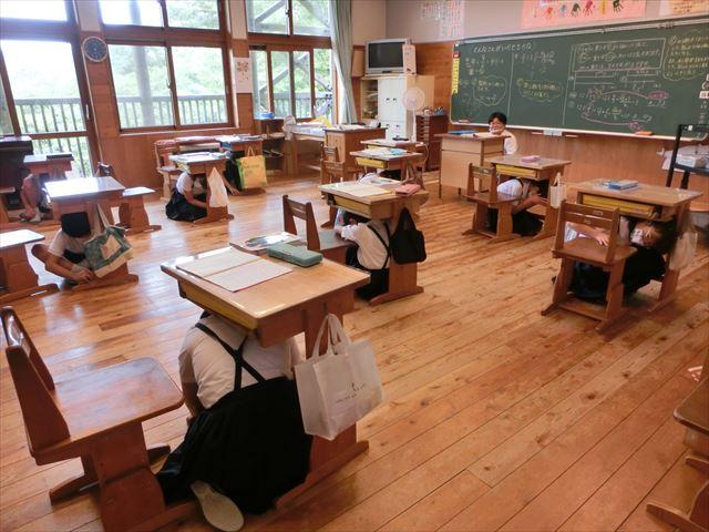 安全行動(しゃがむ・かくれる・じっとする)をとる練習です。11:00の校内放送で、子どもたちは机の