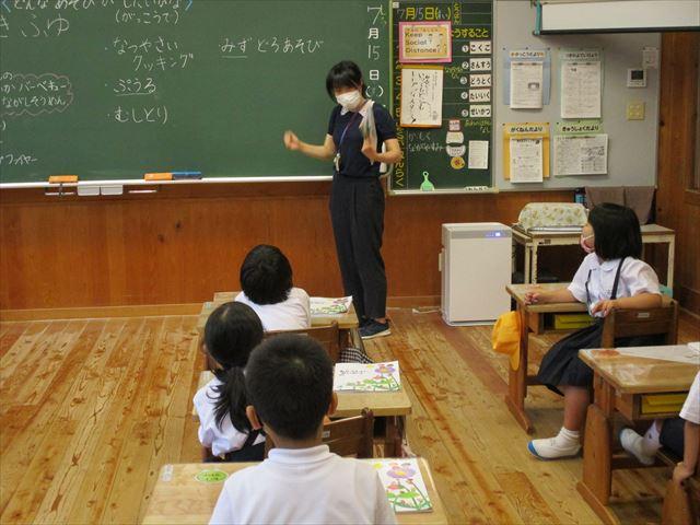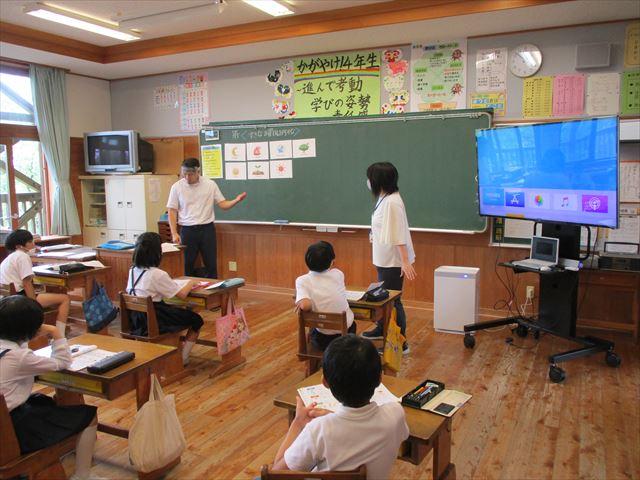 5限が始まる前には全校児童集会があり、5年生が英語での朝の会と帰りの会のデモンストレーションを見せてくれ