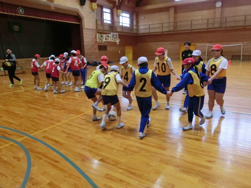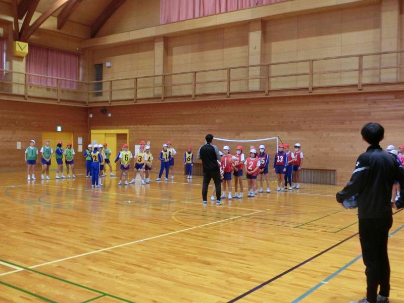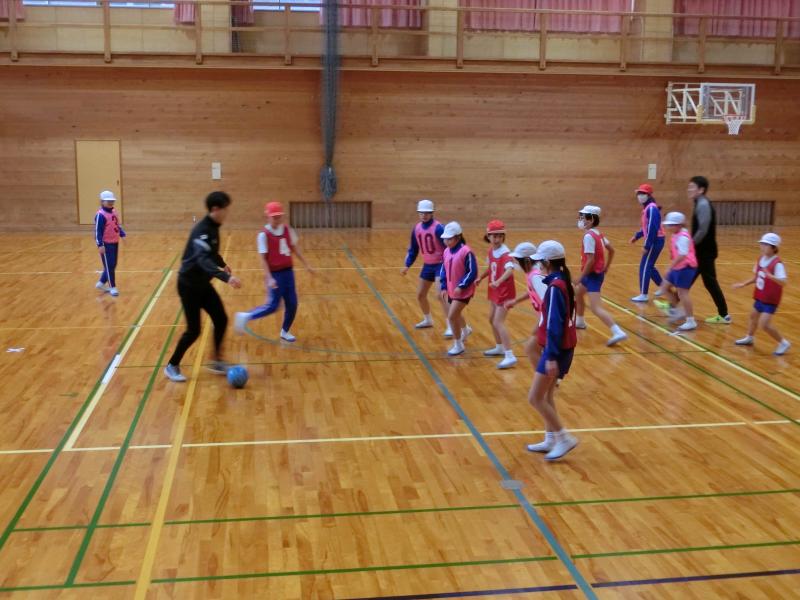 12月15日(月)に,トップスポーツチームによるスポーツ教室が開かれました。この日は,白山市を拠点に活躍しているプロフォットサルチーム「ヴィンサド―ル白山」から,代表の鈴木さんと運営の平田さんが来校されました。4~6年生の38名は,寒い中,汗をかきながら夢中で体を動かしました。体ほぐしの運動やボールを使った運動をしてから,サッカーボールを使い,学年が入り混じったチームでゲームを楽しみました。どの動きでも,コーチが「仲間」や「思いやり」を意識して動くように指示されていたことが印象に残りました。粟ノ保小学校でも大事にしてい行きたいです。