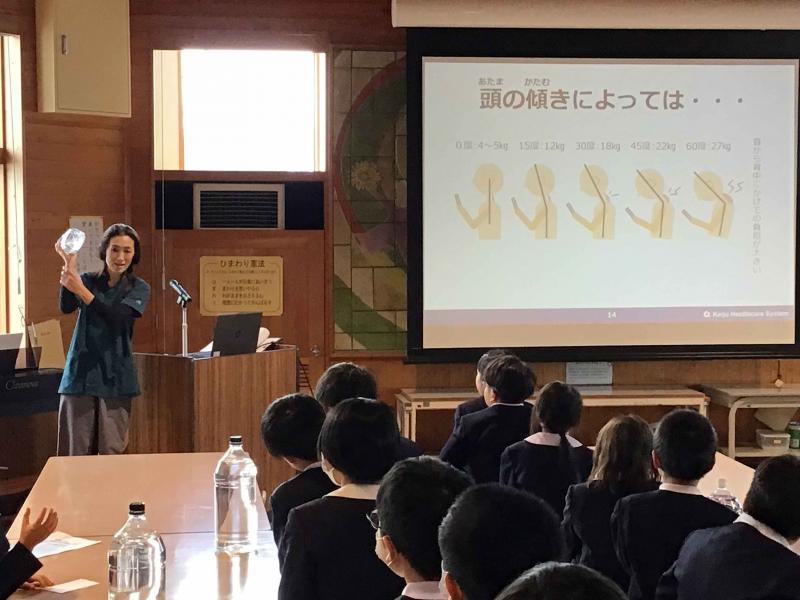 「姿勢」って,とっても大事! 投稿日時 : 01/23 awanoe 1月22日(木)に,学校保健委員会の特別講演として,理学療法士の山下友美さんに来ていただき,姿勢について話をしていただきました。人の頭の重さは,低学年で2㎏,高学年で4㎏です。背筋が伸びている時はいいのですが,頭を傾けると,この重さが背中に数倍の負荷をかけることになります。そして,悪い姿勢は数日で身に付いてしまい,治すには3カ月もかかるそうです。そこで,山下さんから「背筋伸ばし体操」も教えていただき,みんなでやってみました。ぜひ,ご家庭でも実践してみてください。 Tweet {{options.likeCount}} {{options.likeCount}} {{options.unlikeCount}} {{options.unlikeCount}} 0 コメント