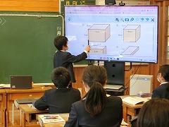 5年生は算数科の学習をしていました。学習した体積の求め方を使って,問題の解き方を説明しています。言葉だけでは伝わらないときには,電子黒板に表示された図をつかって説明していました。