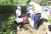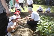 1~4年生は畑の先生の保志場さんの指導を受けながら大根,かぶ,白菜などの苗植え活動をしました。