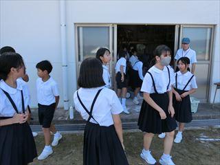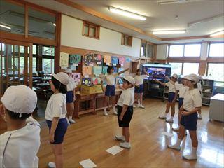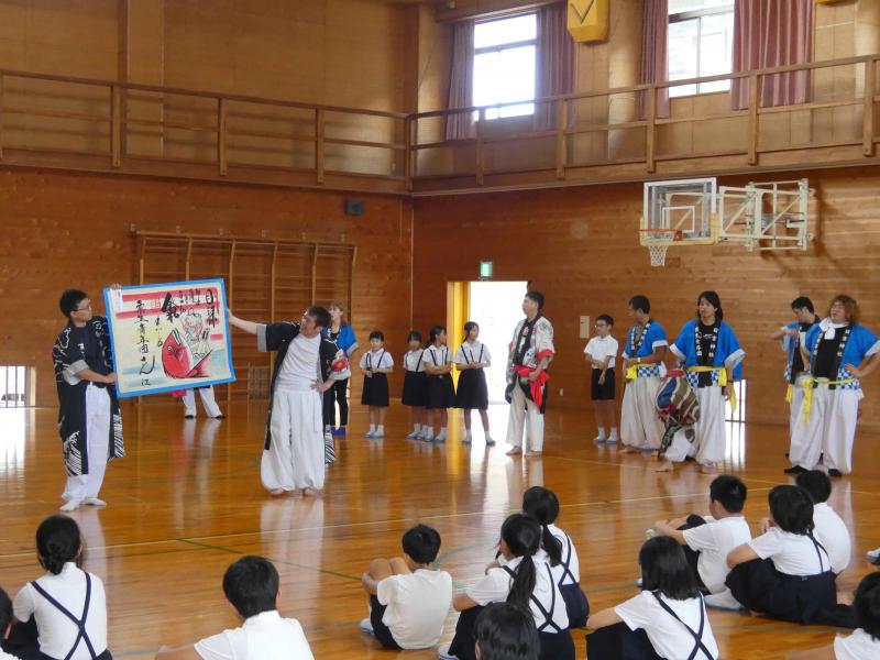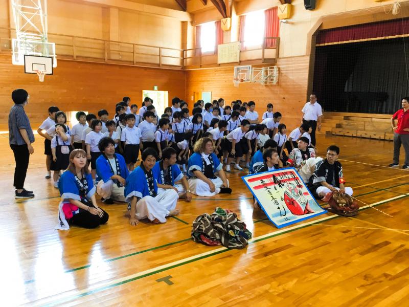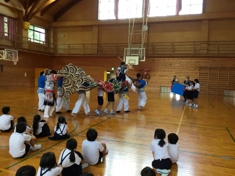 9月5日(金)に粟生町青年団の皆さんが,獅子舞を披露してくれました。粟生町の祭りは翌日の6日(土)ですが,羽咋市内では唯一宵祭りもしているそうです。この日は,団長さんが天狗を務めて,粟生町の子どもたちも蚊帳の中に入って踊ったり,笛を吹いたりして盛り上げてくれました。見ている子どもたちも「うちらと違う。町によって違うね。」と言いながら,自分たちの町の獅子舞について語る姿が見えました。