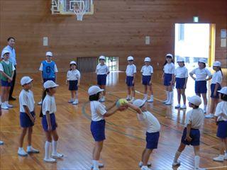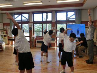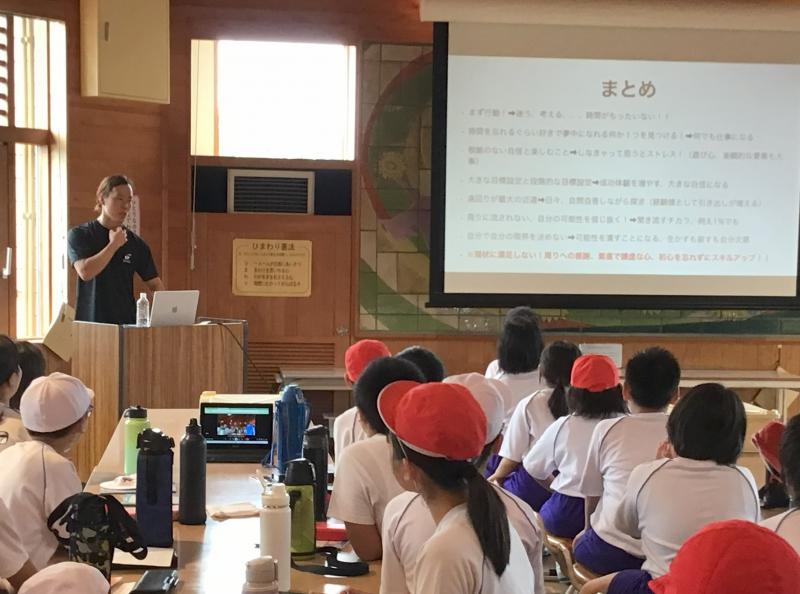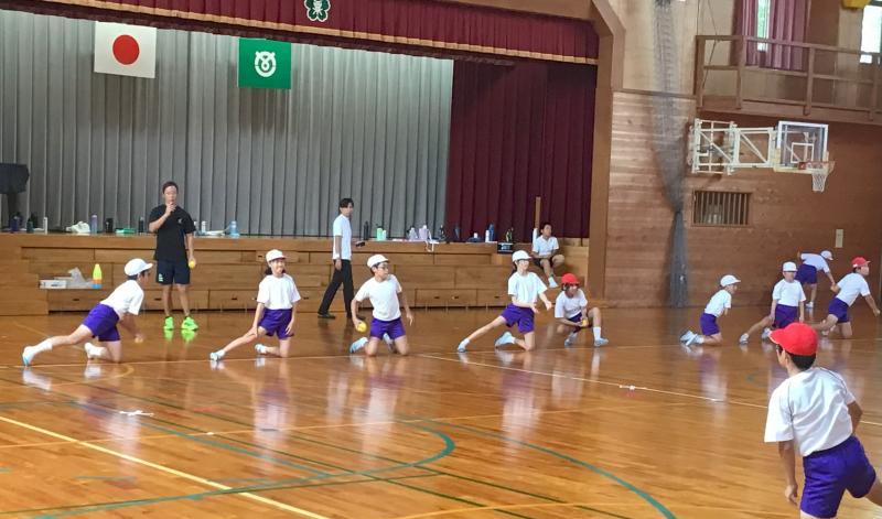 投げる前に体をほぐすいろいろな運動をしました。山岸さんに言われた通りに動くと,体の可動域が広がり,準備運動の大切さをしることができました。後半は股関節のひねりを意識して,実際に投げてみました。コツをつかんで遠くに投げられた人もいました。最後に「まとめ」として,山岸さん自身は麻痺が残っている身ですが,「とにかく行動してみること(時間がもったいない!)」「自分で自分の限界を決めない」など,ご自身の経験をもとに子どもたちへの熱いメッセージをいただきました。