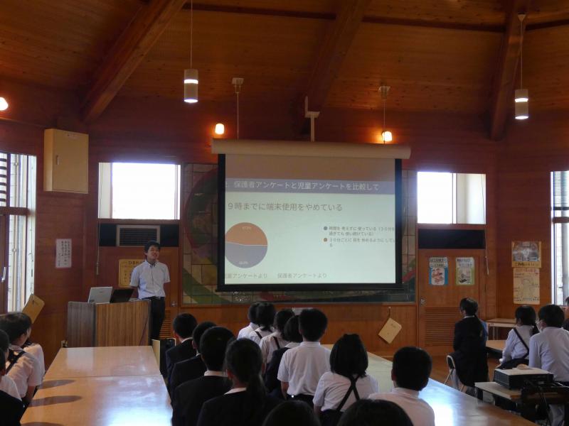 10月15日(水)に,授業参観がありました。5限目に親子道徳,6限目にKDDIのスマホ・ケータイ安全教室が行われました。5限目は,「家族愛」や「節度・節制」をテーマに,家族のために自分ができることや規則正しい生活をすることなどを親子で考えました。また,6限目は,本校でとったアンケート結果(情報端末の使用状況やルールなど)より,使用時間に課題があることを知った上で,スマホの問題点やSNSへの投稿の危険性などを学びました。