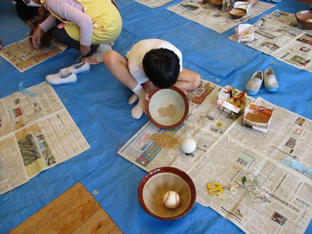 脱穀作業,擂鉢と野球ボールを使って籾摺作業を体験しました。コンバインだと30秒ほどで終わる作業を,