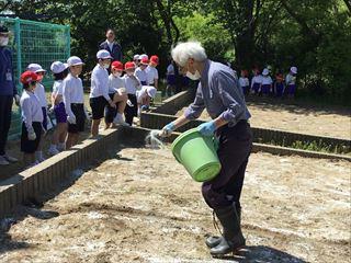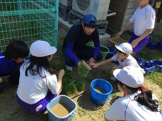 畑の先生(保志場益光さん,橋本廣子さん,高田英治さん)にご指導いただき,夏野菜の土づくり,バケツ稲の土づくりをしました。一週間後にも来ていただき,次は苗植えの指導をしていただく予定です。