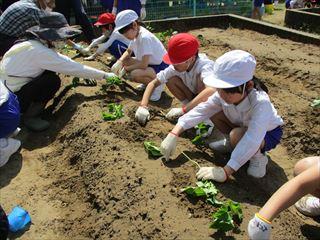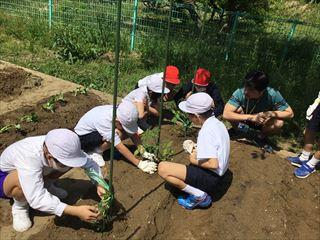 先週に引き続き,畑の先生(保志場益光さん,橋本廣子さん,高田英治さん)にご指導いただき,今回は苗植えをしました。先生方のお話をしっかり聞いて,苗を植えることができました。