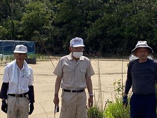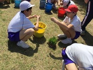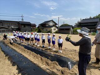 4年生と6年生が,学校近くの酒井さんの畑をお借りし,サツマイモの苗を植えました。老人会の大橋さん,中村さん,川渕さんにご指導いただき,50本の苗植えをがんばりました。
