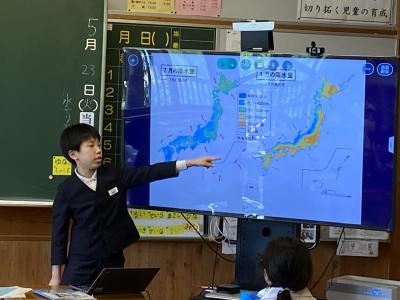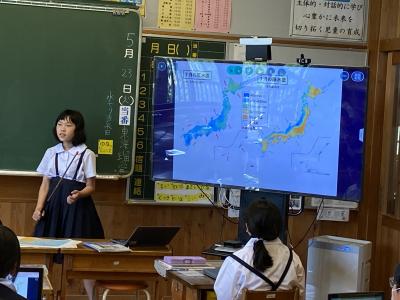 5年生は社会科の学習。地図資料から分かることを,電子黒板を指し示しながら話していました。