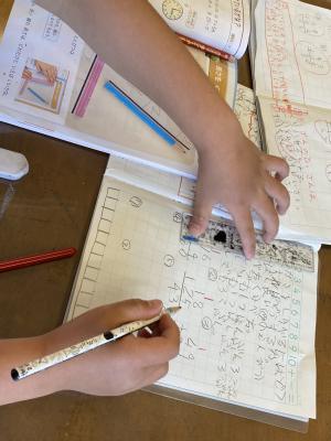 2年生は筆算です。赤鉛筆を使って繰り上がり,繰り下がりをメモして,しっかり「手で考え」ていました。
