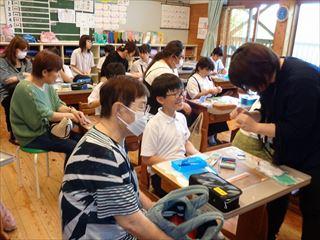 授業参観では,どのクラスも元気よく頑張る姿が見られました。給食試食会は1年保護者を対象に行い,日頃,どんな様子で給食を食べているのかを見てもらいました。CAP講演会は,4年生保護者を対象に行い,子どもへの暴力防止等の講演を聞きました。AED講習会は,6年児童・保護者を対象に行いました。水泳や夏休みのプール当番をするにあたって,消防署の方からAEDの使い方等を学びました。大変忙しい中,たくさんの保護者の方に来ていただき,ありがとうございました。