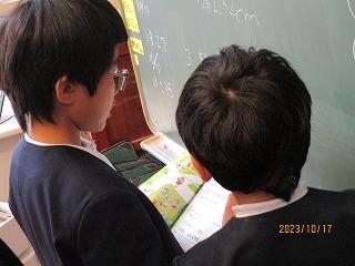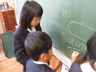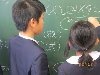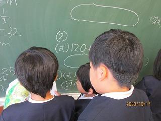 3年生は,算数科の学習をしていました。ペアで問題の解き方について話し合い,まとめていました。その内容を黒板に書き,みんなで交流しました。