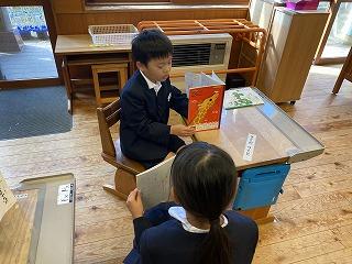 廊下を歩いていると,1年生教室から元気な音読の声が。この日は1年生が国語科で学習した「やくそく」の音読を校長先生に発表していました。読み方や動きの工夫を自分たちで考えたのだそうです。とてもはきはきした声で,素敵な音読でした。
