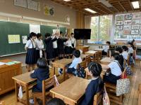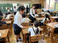 10月25日(水)に5年生は、朝学習の時間を活用して3年生のクラスに行き、英語で12月のクリスマスセレクト給食に向け、英語でどのケーキを食べたいか聞いていました。3年生も英語でがんばって答える姿がありました。