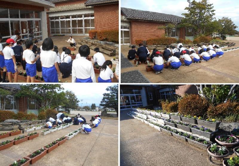 10月24日(木)に、環境委員会が児童玄関前のプランターの花の苗植えをしてくれました。環境委員会は、毎日花の水やりや花がら摘み等のお世話をしてくれています。春・夏の花と入れ替えに、色とりどりの可愛らしいスミレが児童玄関前に並びました。