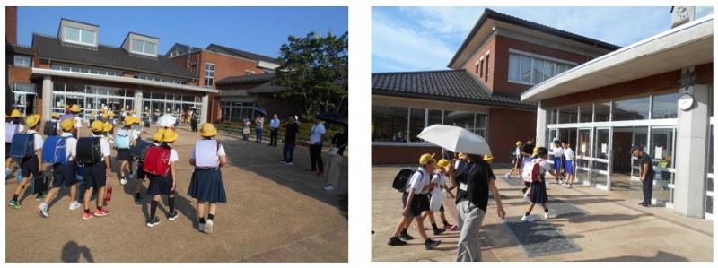 ▢ PTA役員や地区委員等が児童を迎えている様子(9/1) ▢ 北星中の生徒(本校の卒業生)が児童を迎えている様子