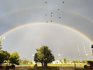16時30分ごろ、なんと学校の前に、二重円のにじがかかっていました。