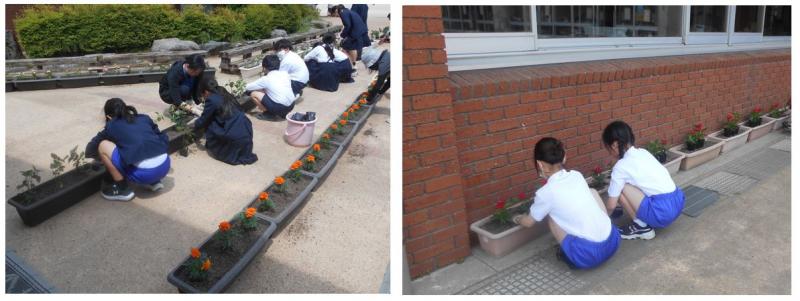10月23日(木) 環境委員による花の苗植えを行いました。5種類のビオラの苗240株をプランターに植え、児童玄関前と地域開放玄関前に配置しました。