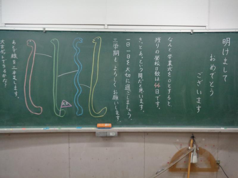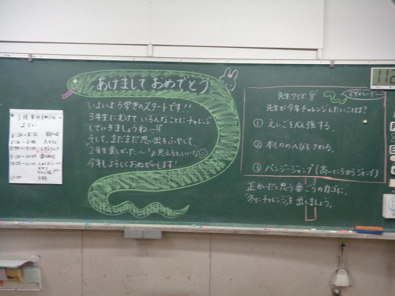 いよいよ3(0)学期が始まりました。今年はへび年!校長先生のお話は「1年の計は元旦にあり」「へびのようにどんどん進化しよう」でした。ということで、昨日学校で発見されたへびの抜け殻を玄関前に掲示し、一番長いものを始業式で子どもたちに見せました。う~ん、私の感覚では1メートル50センチというところでしょうか・・・