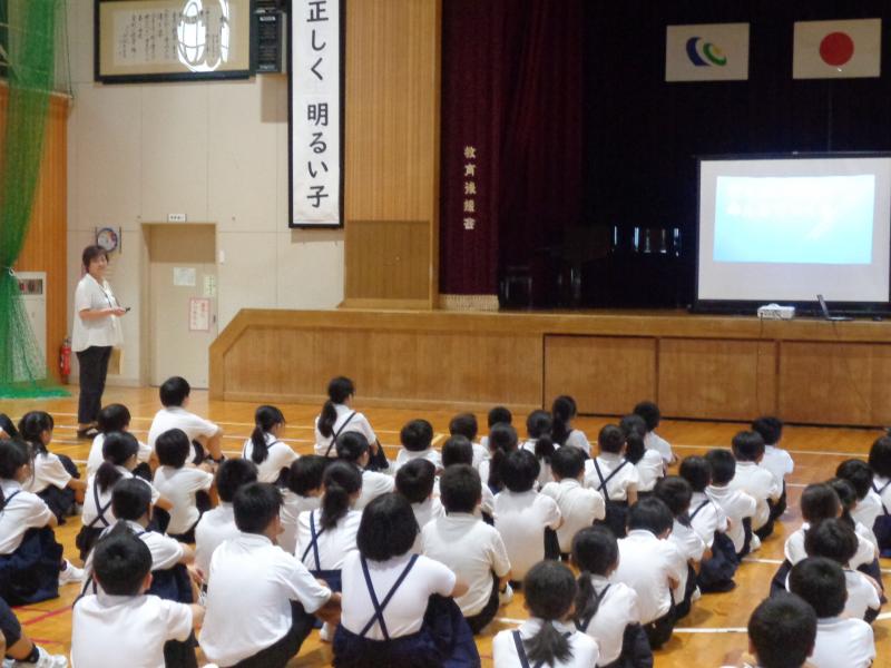 集会では、校長先生から広島、長崎の写真を見ながら、平和についてお話がありました。そして、校長先生は、平和の歌を全校児童の前で披露されました。子どもたちの心にもきっと響いたはず・・・その後は、各教室で平和学習を行いました。