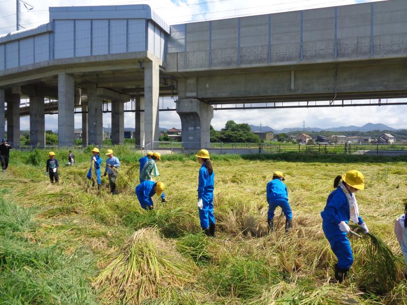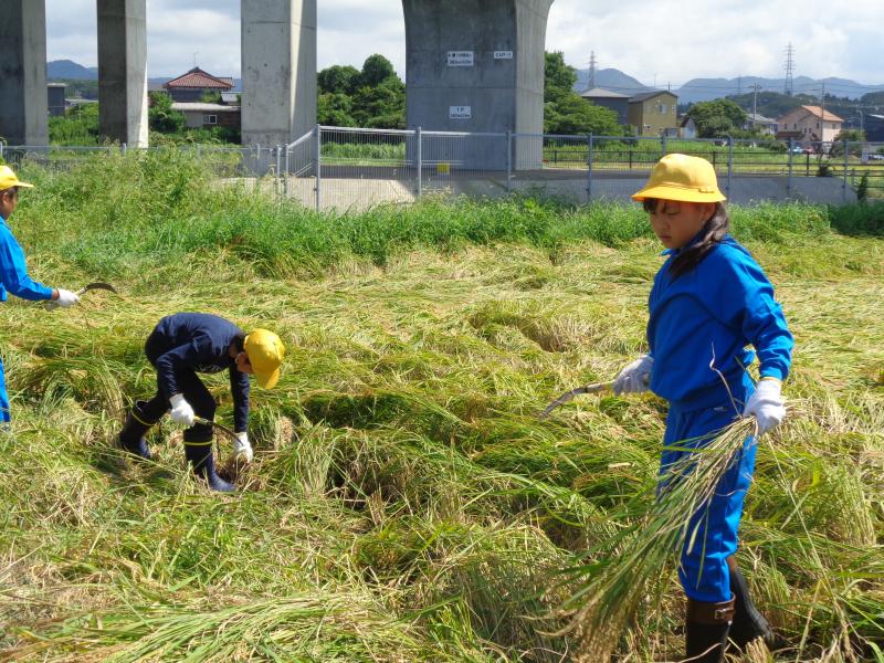さらに、5限目に、5年生が稲刈り体験をしました。春に植えた苗が大きく育ち、子どもたちは稲穂を鎌で刈る体験をしました。刈り方の指導だけでなく、これまでお世話いただいた藤井さんに本当に感謝申し上げます。今後、収穫したお米でおにぎりを作る予定です。