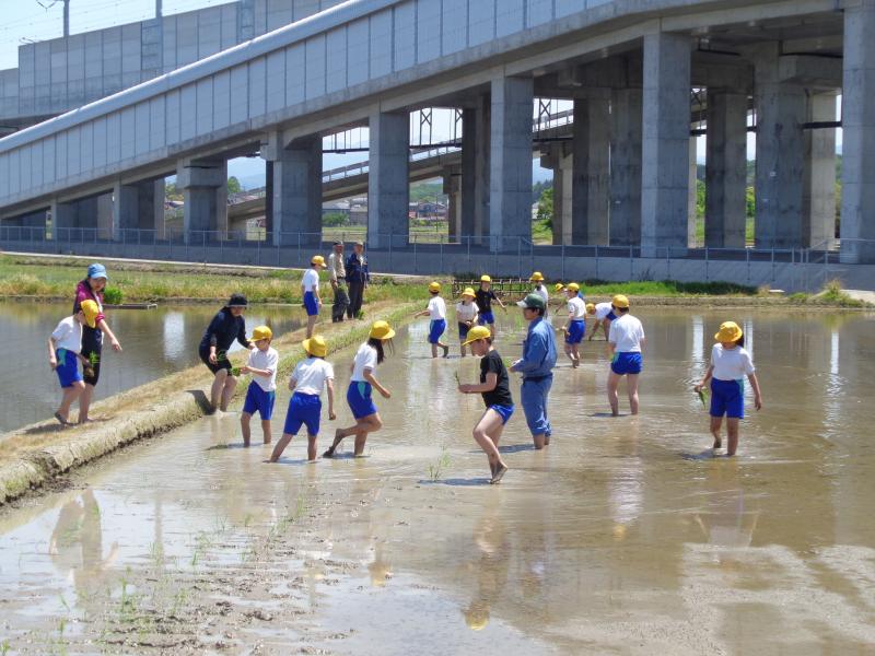 5年生が田植えの体験をしました。分校町の藤井さんの田んぼをお借りし、藤井さんやJAの方に植え方を教えていただき、素足で田んぼの中に・・・