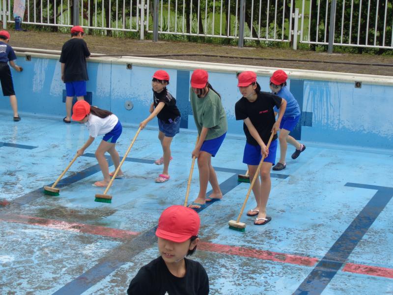 いよいよ水泳シーズンを迎えます。5、6年生は、一生懸命プール掃除に励んでいました。天気もよく、最高のプール掃除、水浴び?日よりでした。