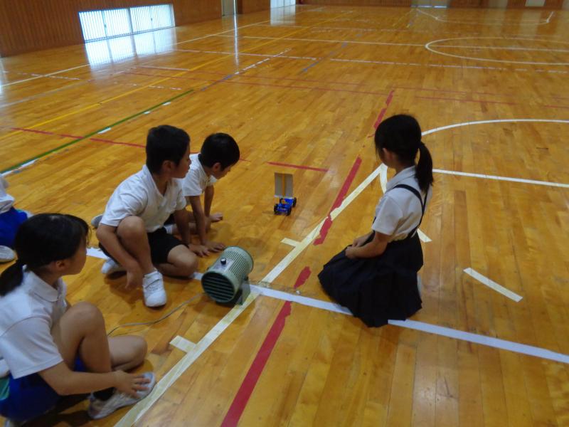 3年生は、理科の学習で風の力で車を走らせていました。ここで大切なことは「条件をそろえること!」理科の実験の鉄則ですね。3年生は慎重に実験に取り組んでいました。