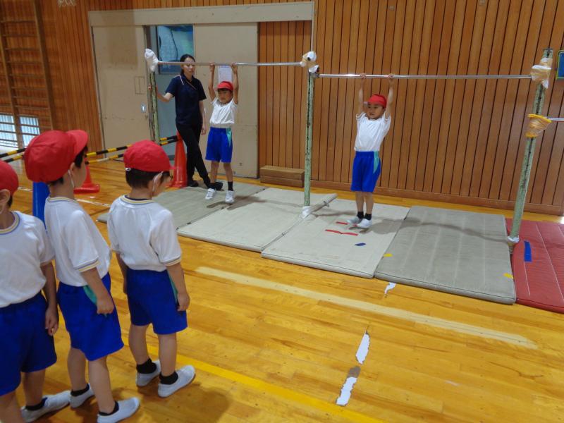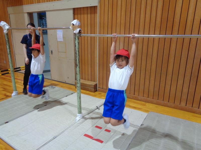 1年生は、天候が悪かったのでプールには入らず鉄棒をしました。一生懸命鉄棒にぶら下がる姿はとってもかわいかったです。きっとぶらさがって力もついたのではないでしょうか!